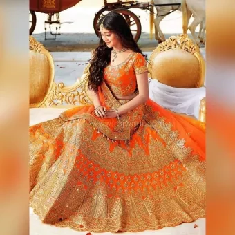 Description: Lehnga or langa, (also known as Ghagra or gagra, Chaniya, Pavadai and Lacha) is a form of full ankle-length skirt worn by women[1][2] from India which is long, embroidered and pleated. It was worn in old Hindu tradition and was believed to awaken the spiritual chakras of the body. It is worn as the bottom portion of a Gagra choli or Langa Voni. It is secured at the waist and leaves the lower back and midriff bare. In the Indian subcontinent, various types of traditional embroidery work are done on lehenga, with Gota patti embroidery being one of popular types for the festivals and weddings. In the earlier times, girls would wear Ghagra-choli. Today, this attire has become outdated. Even then, in States like Gujarat and Rajasthan, young girls and women still wear lehnga. Lehnga is one of the appropriate garments as per the Hindu culture and considered a sattvik garment at the spiritual level as well.