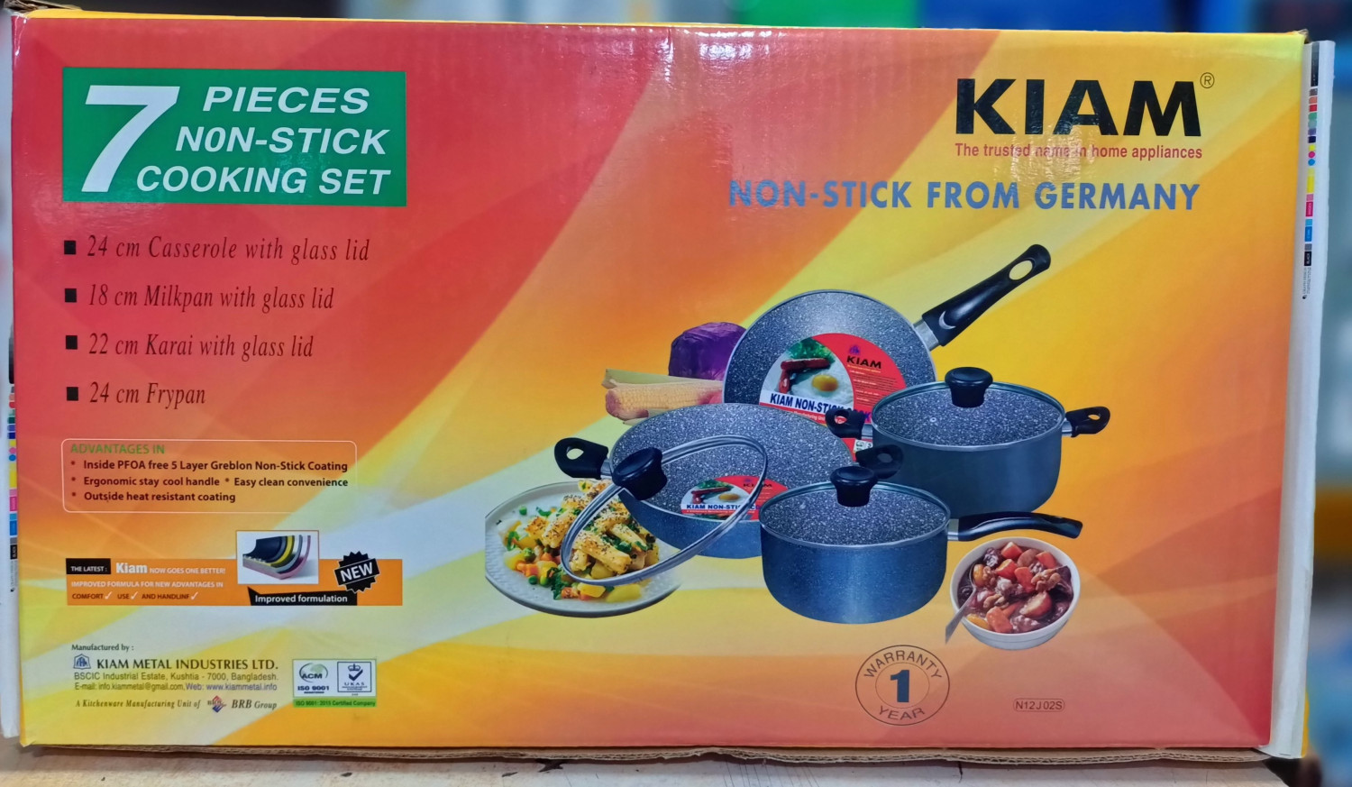 Product details KIAM Non Stick 7 pcs Cookware Set (induction) Brand: Kiam Quantity: 7 Pcs Set Strong handle and can resist fire Material: 100% aluminum made body No-sticky coating what ca save 60% of your oil, ghee, and butter Color: Black and Silver.
