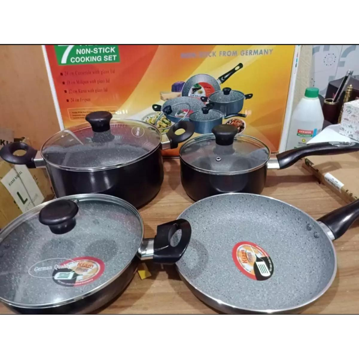 Kiam Quantity: 7 Pcs Set Strong handle and can resist fire Material: 100% aluminum made body No-sticky coating what ca save 60% of your oil, ghee, and butter Color: Black and Silver