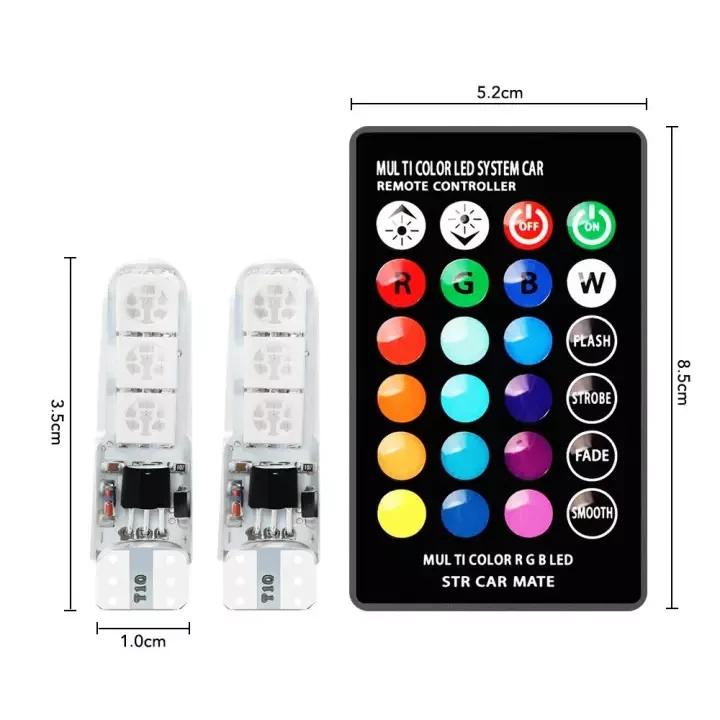 Low temperature, low power consumption & lasts up to 50k hours. With wireless remote control, it is possible to set the light color to be Red, green, blue, white and so on. The brightness is adjustable, with two buttons on the controller, you just have to press the button to turn up or turn down the brightness. Four different lighting modes: flash mode, strobe mode, fade and smooth mode1. Flash mode: Colorful dazzling changes2.Strobe mode: Colorful gradual changes3. Fade mode: Colorful with dazzling changes and fade in and out4.Smooth mode: Flashing between red and blue Specifications: LED Type: T10 5050 SMD LED LED Number:6Voltage: DC 12VPower: 2WLight color: RGB Remote Control: Powered by a CR2025 Button Cell Battery(Included)Size of the Remote control: approx. 9.4x 5x 0.5cmSize of the lamp: approx. 3.4x0.9x0.9cmInstallation Instructions: Before installation, cut off the power switch and turn the lamp off. Fitment: Applicable To Most Car/Motor Model With T10 Socket. Packing Included:2 x T10 LED Car/Motor Lights1 x Wireless Remote Control.